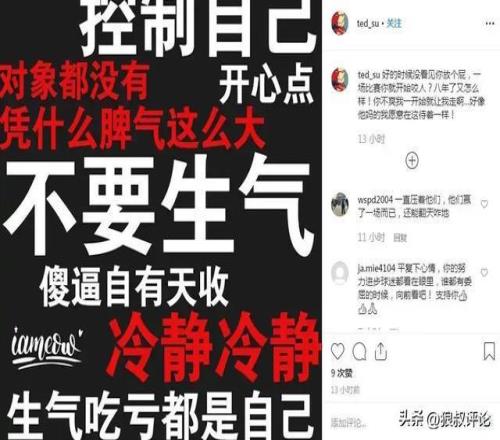 蘇若禹還曬出了一張圖,圖上寫著“不要生氣”、“控制自己”、“開心點(diǎn)”、“傻X自有天收”、“冷靜冷靜”等字樣。