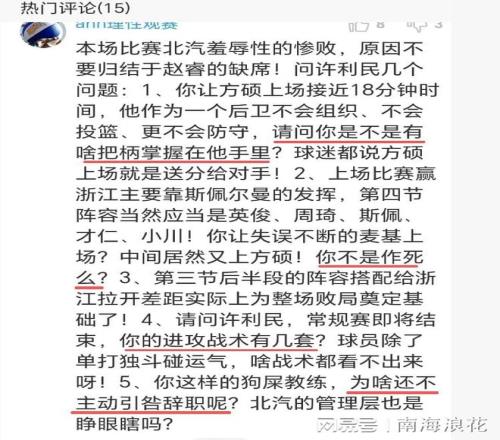 北京球迷更是眾口一詞對準許利民,嚴重質疑他的臨場指揮,直接四問許利民:1、你讓方碩上場接近18分鐘時間,他作為一個后衛不會組織、不會投籃、更不會防守,請問你是不是有啥把柄掌握在他手里?2、上一回合贏浙江主要靠斯佩爾曼的發揮,第四節陣容當然應當是英俊、周琦、斯佩、才仁、小川!你今天讓失誤不斷的麥基上場?中間居然又上方碩!你不是作死么?3、請問許利民,常規賽即將結束,你的進攻戰術有幾套?球員除了單打獨斗碰運氣,啥戰術都看不出來呀!4、你這樣的GS教練,為啥還不主動引咎辭職呢?北汽的管理層也是:睜眼瞎嗎?