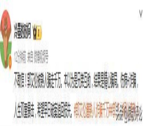有知情人士透露,嫌疑人系郭艾倫身邊好友,以“投資入股”為名誘導其轉賬近千萬元。轉賬后,該嫌疑人一度失聯,資金去向不明。