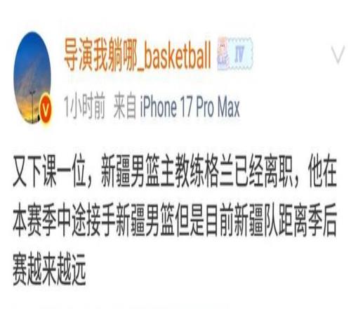 新疆男籃本賽季的表現(xiàn)非常糟糕,目前只是以12勝22負(fù)的戰(zhàn)績排名倒數(shù)第四,基本上已經(jīng)無緣季后賽。據(jù)媒體人“導(dǎo)演我躺哪兒”透露,由于帶隊成績沒有達(dá)到預(yù)期,新疆男籃主教練格蘭已經(jīng)離職。至于誰會成為新疆男籃的新任主教練,目前還沒有確切的消息。不出意外的話,老帥姜正秀應(yīng)該會以臨時主教練的身份執(zhí)教球隊。