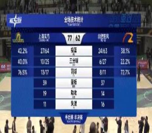 手握賽點的上海玄鳥隊開場便破釜沉舟,客場作戰的合肥狂風隊為延續希望同樣打得極為強硬。比賽如預期般高強度對抗:首節玄鳥20比15領先,次節狂風16比10回敬,半場結束,玄鳥以30比31落后。好在下半場,上海玄鳥在外援拉維特的帶領下逐漸拉開了比分,尤其是第四節打出了23比13的小高潮,最終在在主場球迷的歡呼聲中以77比62拿下這場關鍵勝利。
