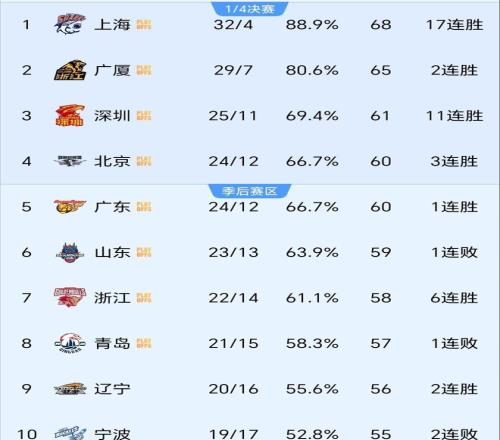 依據(jù)最新官方排名,北京隊與廣東隊同為24勝12負,北京憑借微弱小分優(yōu)勢占據(jù)第四,廣東則暫列第五。