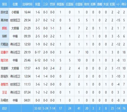 本場比賽,傷愈復出的克里斯狀態平平,得到10分2籃板。珀塞爾拿下全隊最高的18分7籃板10助攻,是全隊發揮最出色的外援。陶漢林依舊強硬,在麥基和周琦面前得到13分10籃板。其他球員無人得分上雙,約翰遜如同夢游,9投僅1中,得到2分。瓊斯上場9分半,得到6分2籃板。