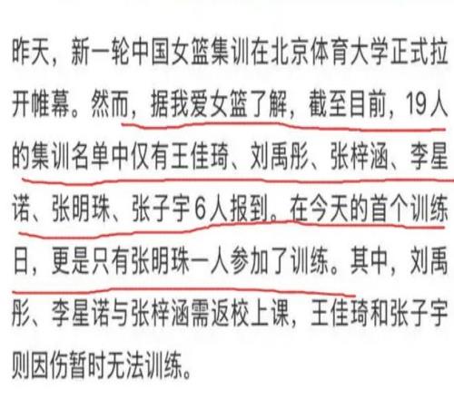 據(jù)中國籃協(xié)訓(xùn)練管理部4月15日晚間通報(bào),當(dāng)日實(shí)際完成報(bào)到手續(xù)的球員共6人,分別為張明珠、張子宇、王佳琦、劉禹彤、李星諾、張梓涵。她們或因所屬WCBA俱樂部賽季已結(jié)束,或?yàn)楦咝T谧x學(xué)生,具備提前歸隊(duì)的客觀條件。