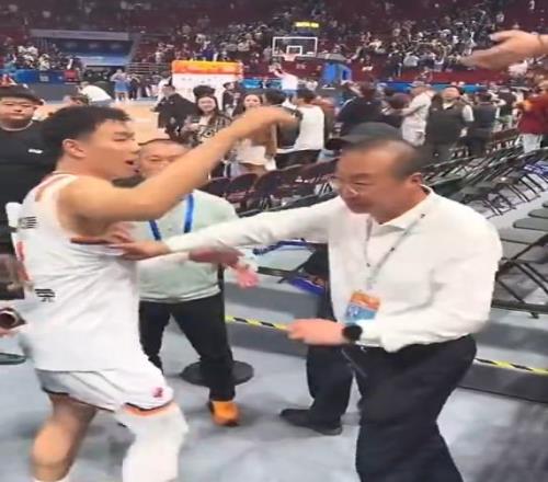 賽后,上海男籃球員李添榮想要與場邊球迷擊掌互動,結果被一名白色衣服的工作人員多次推搡與呵斥,阻擋他與球迷進行互動。