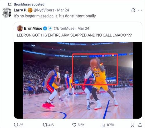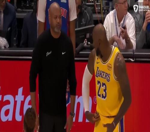 在對陣活塞的比賽中,詹姆斯只出手10次,外線投籃2次,其余八次都在三秒區內可他只獲得3次罰球,而且這場比賽有兩個爭議判罰,第一節詹姆斯明顯被打手但活塞挑戰成功,第四節詹姆斯封蓋后活塞則挑戰成功是一個干擾球。41歲的勒布朗多次被裁判針對。