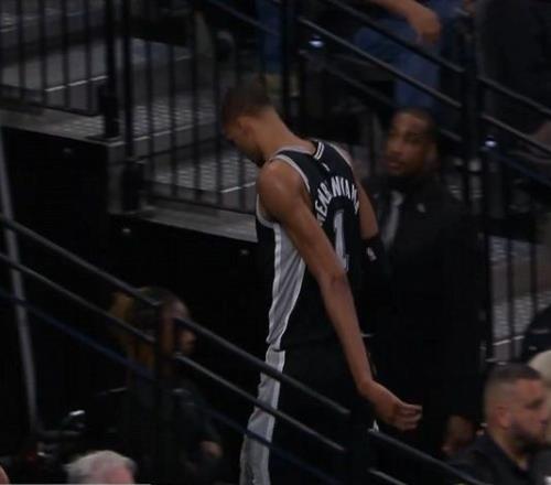 在比賽進行到距離上半場結束還剩不到1分鐘時,文班亞馬叉腰摸著腿部被換下場,也是重新返回更衣室接受檢查治療。