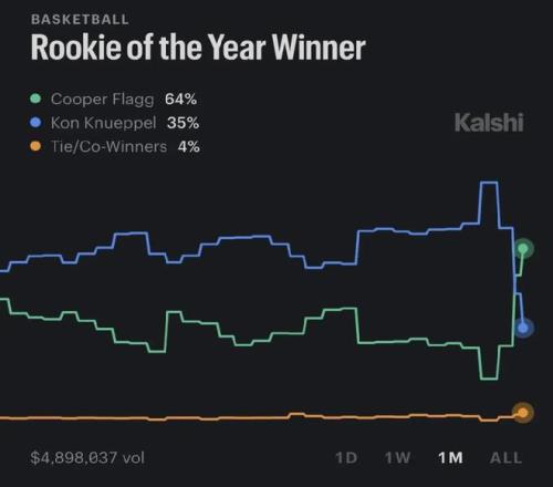 在克尼普爾撞上新秀墻、弗拉格大爆發之前,我們本以為,本賽季的最佳新秀已經沒有懸念,然而現在懸念又重新回來了,克尼普爾甚至落于下風——弗拉格51分+45分之后,他的最佳新秀概率已經反超了克尼普爾。