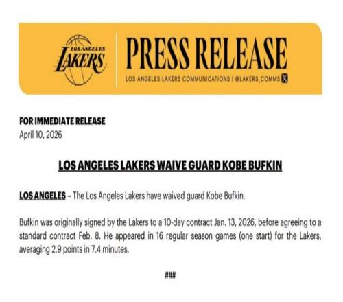 北京時間4月11日,湖人官方宣布裁掉后衛科比-巴夫金。這筆操作將為湖人15人正式大名單騰出一個名額,球隊預計在...