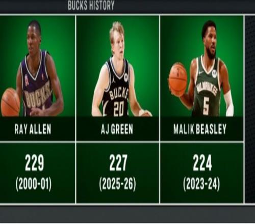 其四,格林本賽季227記三分升至雄鹿隊史第二位。