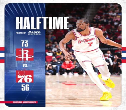 火箭隊的杜蘭特上半場得到17分,湯普森得到12分;76人隊的馬克西得到15分,烏布雷得到14分,埃奇庫姆得到10分。