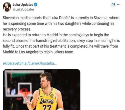 湖人隊一如既往支持東契奇的決定,認為在兩輪療程之間短暫回到斯洛文尼亞不僅不會影響東契奇復出的進程,反而有利于東契奇滋養他的心靈,湖人隊深知頭號球星的心理健康與身體健康同等重要,在斯洛文尼亞短暫休整后,東契奇將重返西班牙接受新一輪治療,然后從西班牙直飛洛杉磯,預計將在一周內與湖人隊匯合。