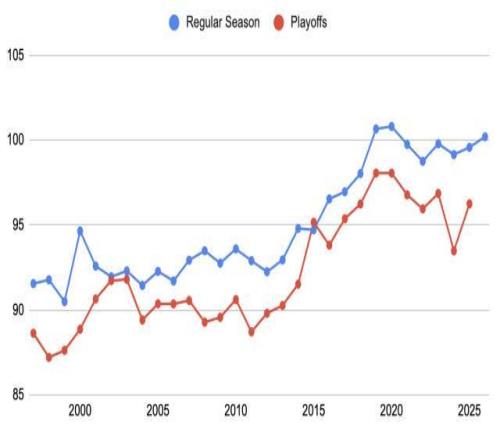 總體而言,隨著比賽重要性的提升,節(jié)奏往往會(huì)放慢。自1996-97賽季以來(lái)的28個(gè)賽季中,有27個(gè)賽季的季后賽節(jié)奏都低于常規(guī)賽。平均來(lái)看,季后賽每48分鐘的回合數(shù)會(huì)減少2.7次。這并不是因?yàn)檫M(jìn)入季后賽的球隊(duì)本身節(jié)奏更慢,而是季后賽環(huán)境導(dǎo)致的變化。
