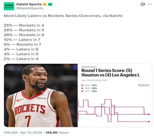 此前ESPN的12位專家一致認(rèn)為這組首輪對(duì)決是火箭晉級(jí),根據(jù)數(shù)據(jù)美媒Kalshi Sports寫道,火箭4場(chǎng)晉級(jí)概率25%、火箭5場(chǎng)晉級(jí)概率26%、火箭6場(chǎng)晉級(jí)概率26%、火箭7場(chǎng)晉級(jí)概率9%。換言之火箭橫掃湖人的概率比湖人所有的晉級(jí)概率加起來(lái)都高。