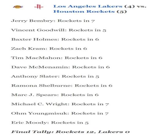 在4月14日季后賽對陣出爐時,就有數據媒體預測火箭淘汰湖人的概率超過80%,而在ESPN12位專家的預測中全都看好火箭晉級:三人看好4-1,六人看好4-2,三人看好4-3。