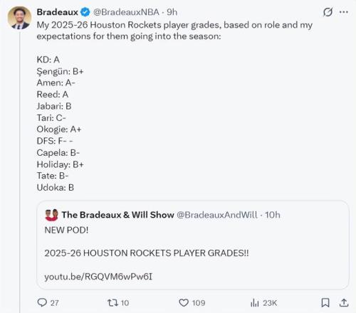 休媒Bradeaux對本賽季火箭隊的球員進行評級: