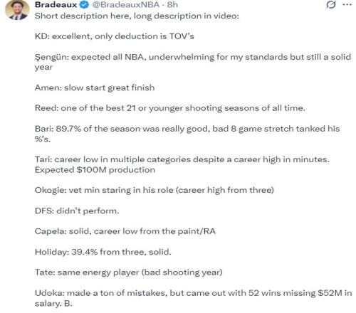 最終的評分,杜蘭特A、申京B+、阿門A-、謝潑德A、小賈B、伊森C-、奧科吉A+、芬尼F--、卡佩拉B-、霍勒迪B+、泰特B-、烏度卡B。(雖然沒有范弗利特、亞當斯陣容還是很強)