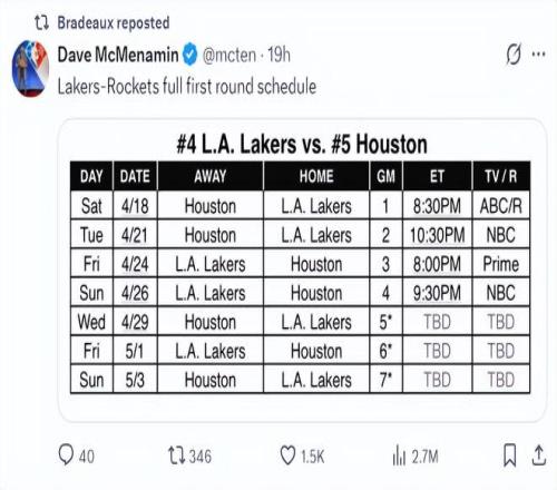 火箭VS湖人的賽程已經全部出爐,4月18日開啟第一場,4月21日第二場,4月24日第三場,第四場4月26日,第五場4月29日,第六場5月1日,第七場5月3日。