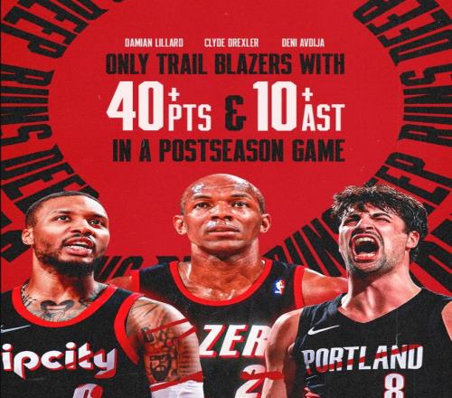 阿夫迪亞在對陣太陽的比賽中拿到了40+10助攻的超級數據,他成為開拓者隊史第三位達成這樣數據的球員,比肩德雷克斯勒與利拉德。