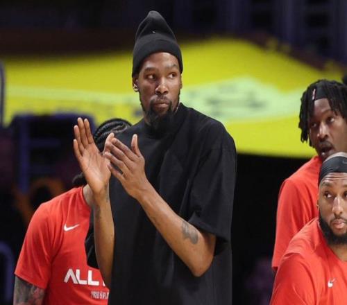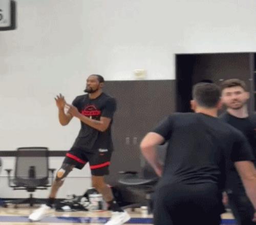 這位明星前鋒因上周四訓練中遭遇右膝挫傷,缺席了周日的季后賽首戰(zhàn),火箭也輸?shù)袅诉@場揭幕戰(zhàn)。在媒體開放的小段訓練時間里,這位37歲球星的狀態(tài)看上去基本恢復如常:他完成跳投、折返跑動、變向移動,動作沒有非常明顯受限,全程面帶笑容。唯一明顯的差別就在他的右膝:杜蘭特的膝蓋纏著運動膠帶固定的防護繃帶。