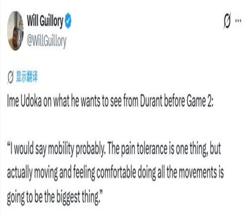 烏度卡談及杜蘭特在G2前需要達到的狀態(tài):“我覺得關鍵還是移動能力。疼痛耐受度是一方面,但能否順暢跑動、完成所有動作且體感無不適,才是最重要的。”