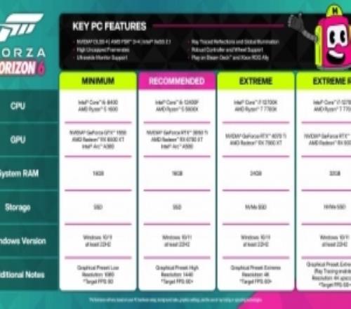 Playground Games發(fā)布了一張非常詳細的配置表,列出了多個性能檔位。雖然在高端配置下,想要開啟4K光線追蹤仍然需要相當強勁的硬件,但低端配置其實相當合理——在最低畫質(zhì)下運行游戲,只需要一張Nvidia GeForce GTX 1650 Ti或者Radeon RX 6500 XT即可。