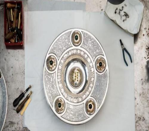 自1903年以來所有德甲冠軍的名字都鐫刻在獎杯上,每個賽季結束后,新冠軍的名字會被添加進去,1981年,沙拉盤首次擴容:加裝了一個銀環,環上配有刻字板以及5顆總重71.98克拉、鑲嵌在黃金底座中的翠榴石弧面寶石