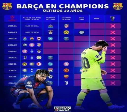 在被淘汰后,有歐洲媒體盤點了巴薩近10個賽季歐冠成績,其中最好的成績?yōu)閮纱芜M入半決賽,兩次最差的成績是倒在了小組賽。具體為,在2024-25賽季和2018-19賽季,巴薩在半決賽中,分別不敵國米和利物浦,倒在了冠軍路上。此外,在2023-24賽季,他們在8強中輸給了巴黎,而在往前的兩個賽季,他們都倒在了小組賽中。另外,在2020-21賽季,他們16強不敵巴黎,2019-20賽季八強不敵拜仁,在2016-17和2017-18的兩個賽季,他們分別在八強戰(zhàn)中不敵尤文圖斯和羅馬。