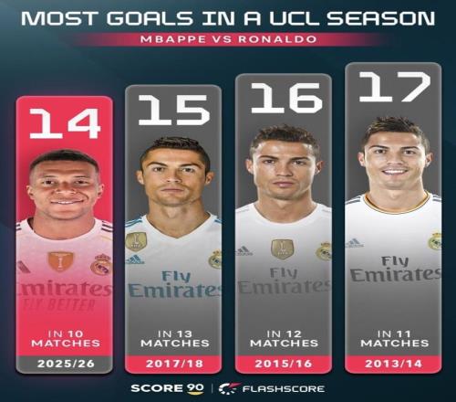 單看進(jìn)球數(shù),姆巴佩離紀(jì)錄確實(shí)很近。10場(chǎng)14球,這早就不是一般的高產(chǎn),而是直接殺進(jìn)了歐冠歷史最頂級(jí)的單季進(jìn)球區(qū)間。歐足聯(lián)數(shù)據(jù)顯示,姆巴佩這賽季在歐冠已經(jīng)有52腳打門,外加1次助攻,說明他的進(jìn)攻參與度極高,絕不是靠某幾場(chǎng)比賽集中爆發(fā)刷出來的數(shù)據(jù)。回看C羅當(dāng)年11場(chǎng)17球的表現(xiàn),無論是效率還是總數(shù)都?jí)旱搅藰O致。姆巴佩現(xiàn)在就差3球,看似一步之遙,但要追的可是歐冠歷史最高級(jí)別的紀(jì)錄。