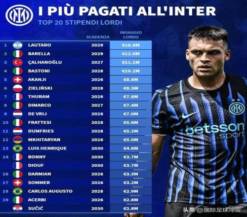 德轉去年11月公布的國米薪資情況(稅前)