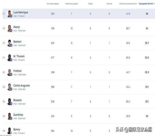 歐足聯關于國米球員的歐冠速度統計