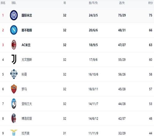 在積分榜上,國際米蘭遙遙領先。國際米蘭24勝3平5負,拿到75分。而本輪那不勒斯和AC米蘭都丟分了,讓國際米蘭的優勢繼續擴大。那不勒斯66分排名第2,落后國際米蘭9分。AC米蘭只拿到63分,排名第3。尤文圖斯60分,排名第4。科莫輸球后依然是58分,無緣超越尤文圖斯,排名第5。羅馬以57分排名第6。第7的是亞特蘭大,拿到53分。
