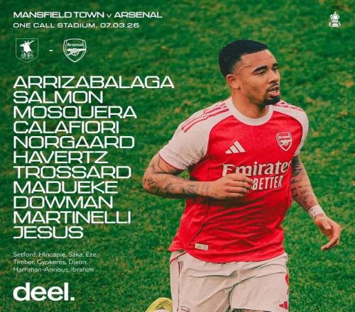 曼斯菲爾德vs阿森納:熱蘇斯、馬杜埃凱首發(fā),道曼、哈弗茨出戰(zhàn)