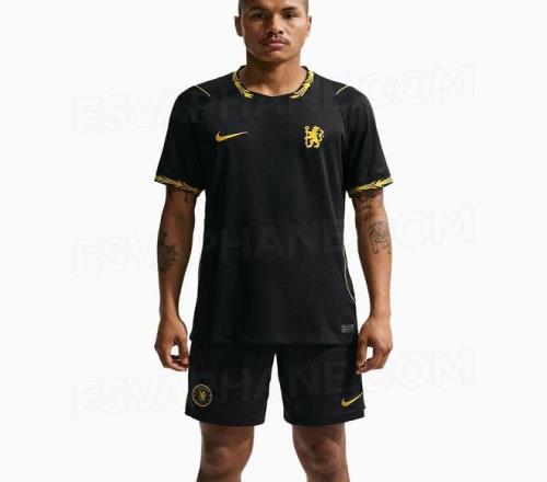此外,球衣上取代標準的完整切爾西徽章的是簡化后的獅子隊徽,采用同樣的黑金配色。切爾西上一次使用這個簡化的獅子標志,還是最近在他們2024-25賽季的第三球衣上。 短褲同樣為黑色,與球衣整體風格保持統一。