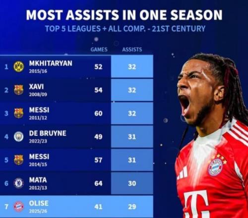 拜仁在歐冠客場2比1擊敗皇馬,奧利塞送出助攻?!掇D會市場》統計顯示他已經躋身新世紀五大聯賽球員單賽季各項賽事助攻榜第7位。德轉列新世紀五大聯賽球員單賽季各項賽事助攻榜: