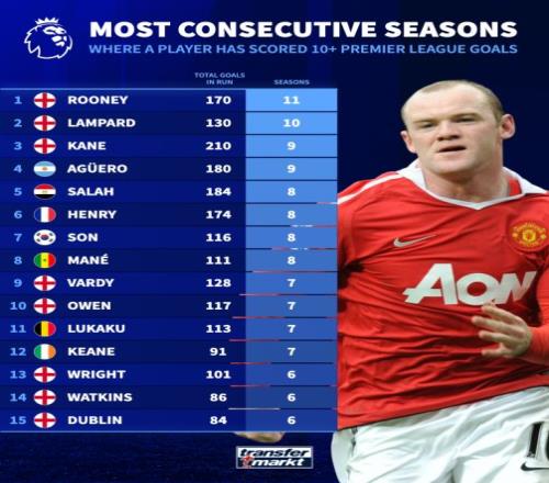 領(lǐng)跑的正是魯尼。這位英格蘭人在2004/05賽季到2014/15賽季之間,連續(xù)11個(gè)賽季英超進(jìn)球上雙,期間共打入170球。