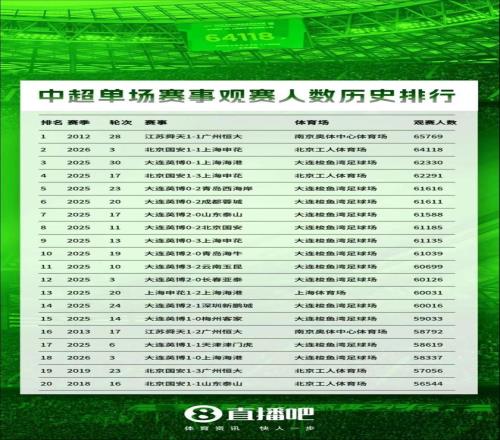 這或許意味著,這是中國球市低谷后反彈的表現。按照直播吧給出的數據,中超歷史上座率TOP20里,從第3名到第15名,全部來自2025賽季。