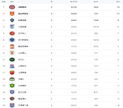 在積分榜上,成都蓉城4勝1平,拿到13分,登上榜首位置。重慶銅梁龍也是不敗戰績,3勝2平,拿到11分,排名第2。云南玉昆贏球之后,總積分達到9分,升到了第3名。大連英博也是9分,排名第4。遼寧鐵人以7分排名第5。深圳新鵬城依然是6分,排名第6。山東泰山3分,排名第8。上海申花和上海海港都是1分。北京國安負1分,排名第13。