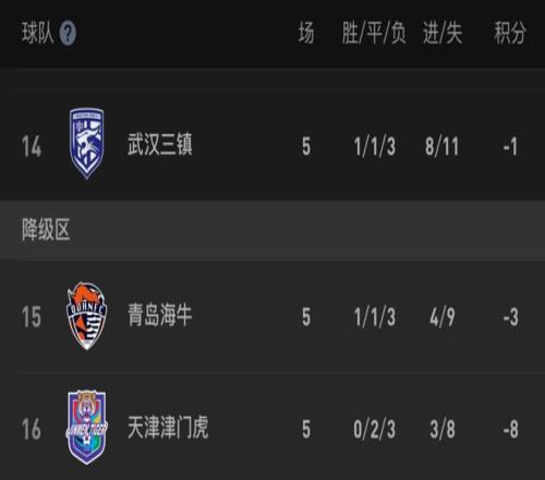 而津門虎5輪后依然一勝難求,繼續(xù)成為中超唯一沒贏球的俱樂部,2平3負(fù)積分為負(fù)8分。