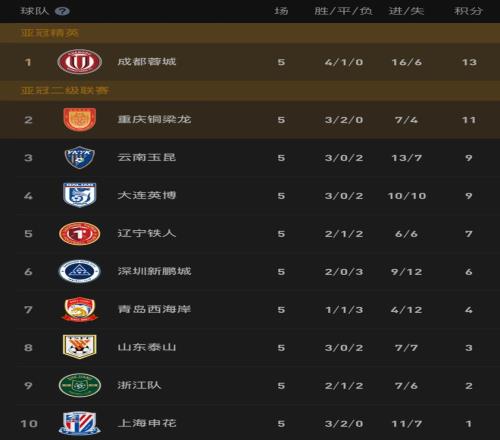 而重慶銅梁龍則在主場2-1力挫武漢三鎮(zhèn)。兩隊5輪后繼續(xù)不敗,而蓉城4勝1平積13分,依然以2分優(yōu)勢繼續(xù)力壓銅梁龍,領(lǐng)跑積分榜。