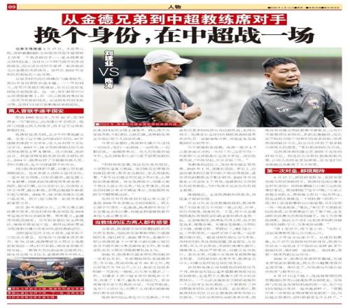 “場上是對手,場下是兄弟。”實際上這是陳濤和劉建業共同的心聲。從少年逐步邁進中年,從球員到教練,從并肩作戰到面對面的對壘,陳濤與劉建業一起見證了中國職業足球20多年起起伏伏,他們的一起奮戰、一起執教,堪稱一段難得的足壇佳話。