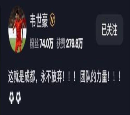 韋世豪社媒慶祝贏球:這就是成都,永不放棄,團隊的力量