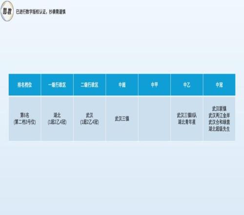 湖北省是第二檔的3號位(總第6名),擁有1超2乙4冠共7隊,全部集中在武漢市,武漢堪稱湖北足球絕對意義上的單核帶隊之城。