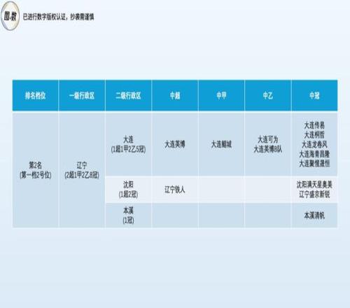 遼寧省是第一檔2號位(總第2名),共有三座城市的13支球隊參與前四級聯賽,組成了2超1甲2乙8冠的豪華陣容:大連以9支球隊且在前四級聯賽均有球隊而成為遼寧足球雙核的第一核心,擁有3支球隊的沈陽則是遼寧足球雙核的第二核心。