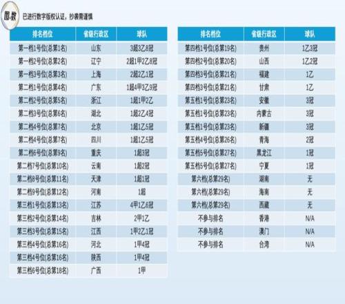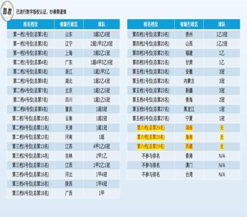 排序的核心原則是中超>中甲>中乙>中冠:第一檔是擁有2支及以上中超球隊的省級行政區;第二檔是在中超有且僅有1支球隊的省級行政區;第三檔是最高級球隊參與中甲的省級行政區;第四檔是最高級球隊參與中乙的省級行政區;第五檔是最高級球隊參與中冠的省級行政區;第六檔是無球隊參與中國前四級聯賽的省級行政區。