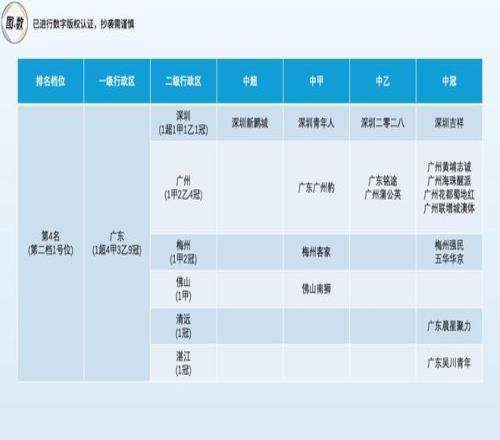 廣東是第二檔的1號位(總第4名),總共有17支球隊參加中國前四級聯賽,是球隊數量最多的省級行政區,其球隊構成是1超4甲3乙9冠,在前四級聯賽各有1隊深圳市與球隊總數多達7隊的廣州市組成了南粵足球的雙子星,而湛江市的廣東吳川青年則是中國前四級聯賽位置最南的球隊,沒有之一。
