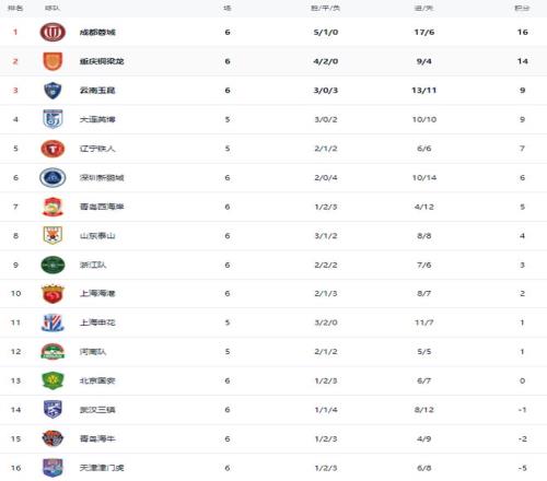 在積分榜上,成都蓉城高居榜首,拿到16分。重慶銅梁龍這匹黑馬4勝2平,拿到14分,排名第2。前2差距只有2分,榜首之爭非常激烈。云南玉昆和大連英博都是9分,排名第3和第4名。山東泰山4分,排名第8。上海海港2勝1平3負,拿到2分,排名第10。上海申花3勝2平,總積分是1分,排名第11。北京國安1勝2平3負,總積分是0分,排名第13。