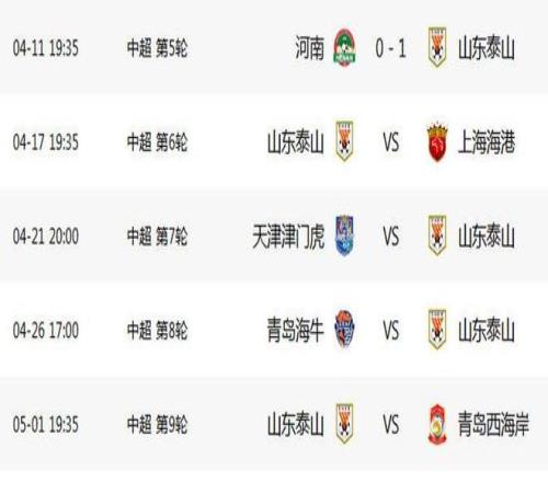 4月21日中超第7輪,泰山客戰天津津門虎,津門虎前5輪難求一勝,僅拿到兩場平局,泰山沒理由不贏。4月26日,泰山客戰倒數第二名青島海牛,不用給洋帥米蘭面子,沒問題吧?5月1日第9輪,泰山主場迎戰青島西海岸,對手整體實力比去年下降很多,韓鵬斬獲五連勝,真有希望。